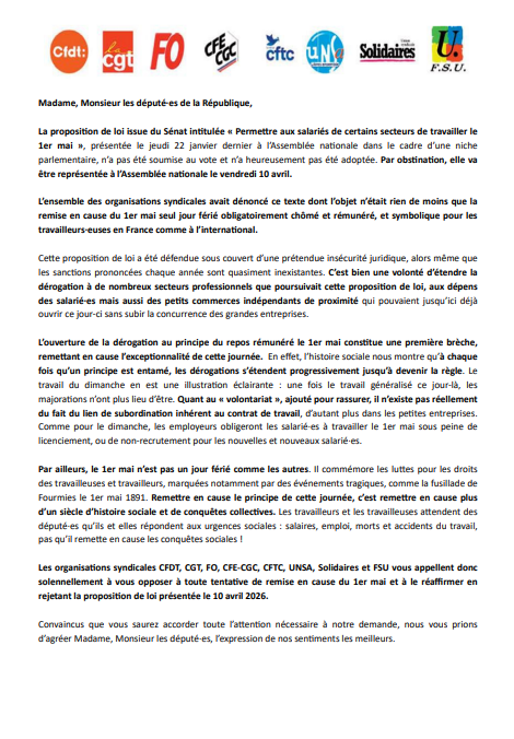 Les organisations syndicales CFDT, CGT, FO, CFE-CGC, CFTC, UNSA, Solidaires et FSU vous appellent donc solennellement à vous opposer à toute tentative de remise en cause du 1er mai et à le réaffirmer en rejetant la proposition de loi présentée le 10 avril 2026.